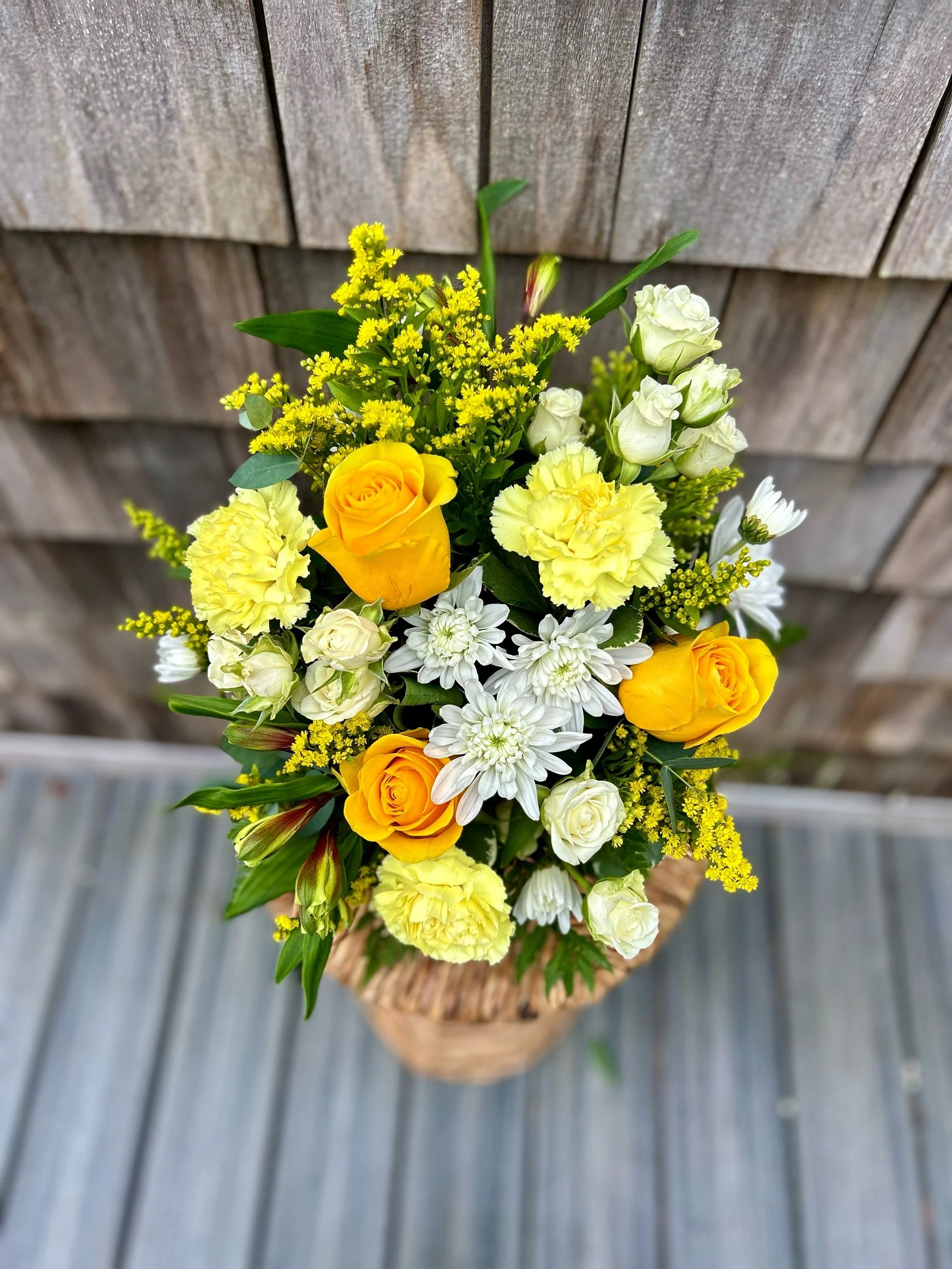 The "Hello Sunshine" arrangement is a dazzling display that brings warmth and joy to any space. Bursting with vibrant hues of yellow, white, and lush greens, this stunning creation features enchanting yellow roses, delicate white mums, cheerful yellow carnations, elegant white spray roses, and a delightful mix of yellow and white fillers. The thoughtfully chosen greenery, including leather leaf, salal, and mixed pittosporum, adds depth and dimension to the overall design.