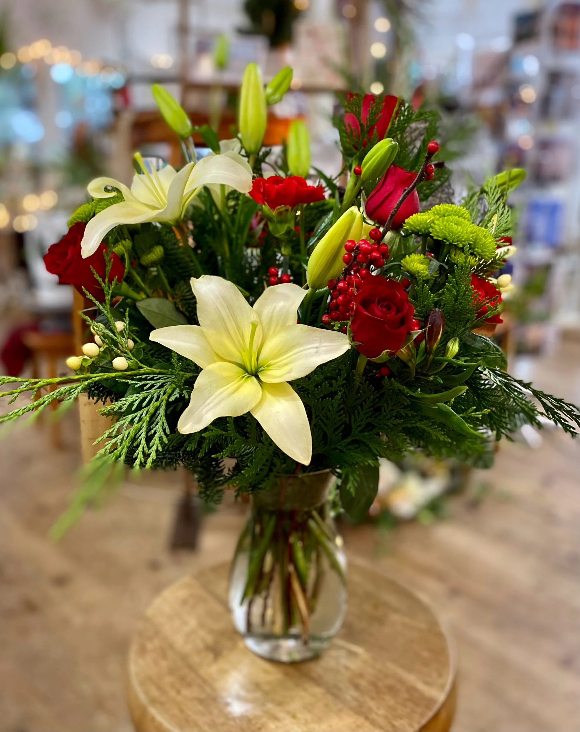 The Christmas cheer is adorned with vibrant red accents and crisp whites, beautifully complemented by long-lasting greenery such as Noble fir and cedar. Seasonal color blooms, including carnations, lilies, roses, and assorted filler flowers, enhance this joyful arrangement. Perfect for celebrating birthdays or simply expressing "I'm thinking of you," it's a wonderful choice for this festive season. While we strive to include all the flowers featured in the arrangement, please know we will do our best to replicate it as closely as possible. If you have any questions, feel free to reach out anytime. Once you've chosen an arrangement you love, simply select your preferred size and add it to your cart. Delivery details will then appear—just fill in the recipient's information along with your name and a reliable phone number. There's also a special instructions box where you can share any specific details for your order. Please be aware that substitutions may occur if certain flowers are unavailable, but we aim to make your arrangement as similar to the photo as possible. Thank you so much for choosing us!