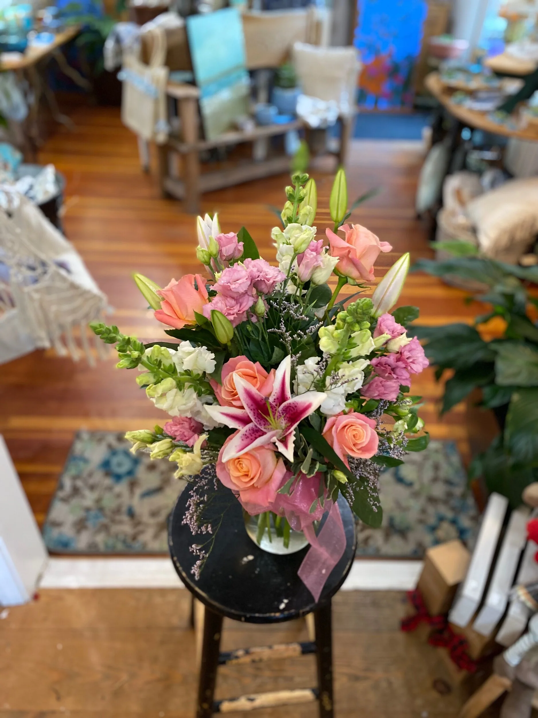 The Stargazing Charm bouquet is a wonderful fragrant option. It has Stargazers, roses, and snapdragon’s. Along with an assorted of greenery and filler flowers.